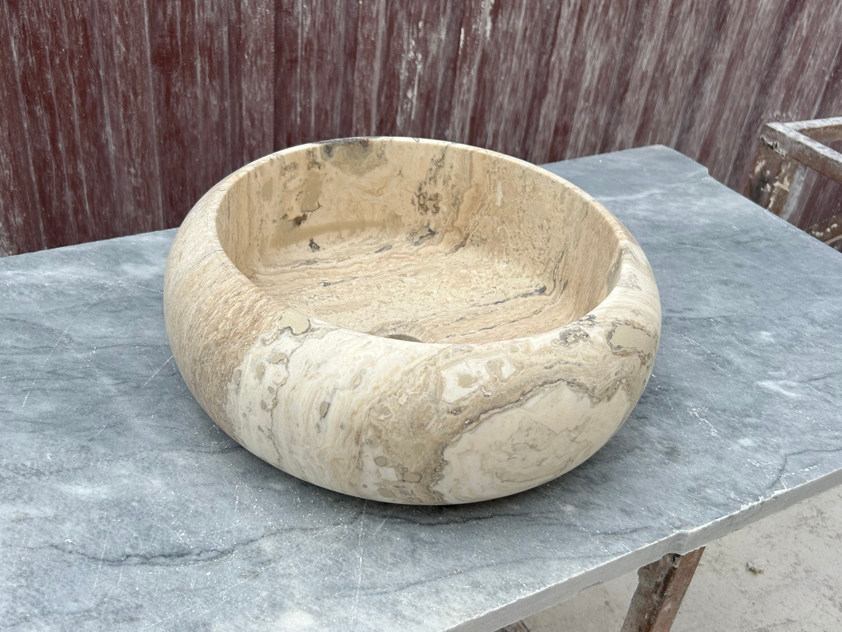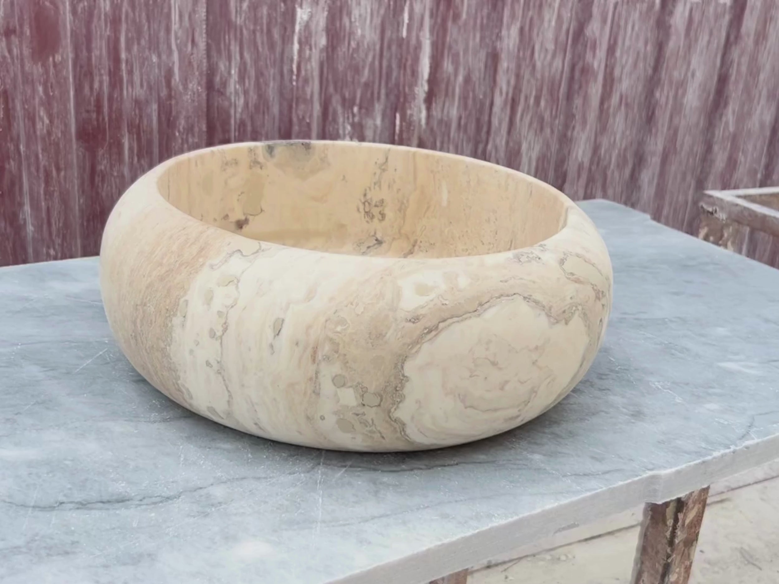 Introducing the Beige Travertine Vessel Sink, a beautiful hand carved masterpiece to any bathroom. This round shape wash basin adds a touch of elegance to your bathroom and is perfect for any bathroom vanity top.