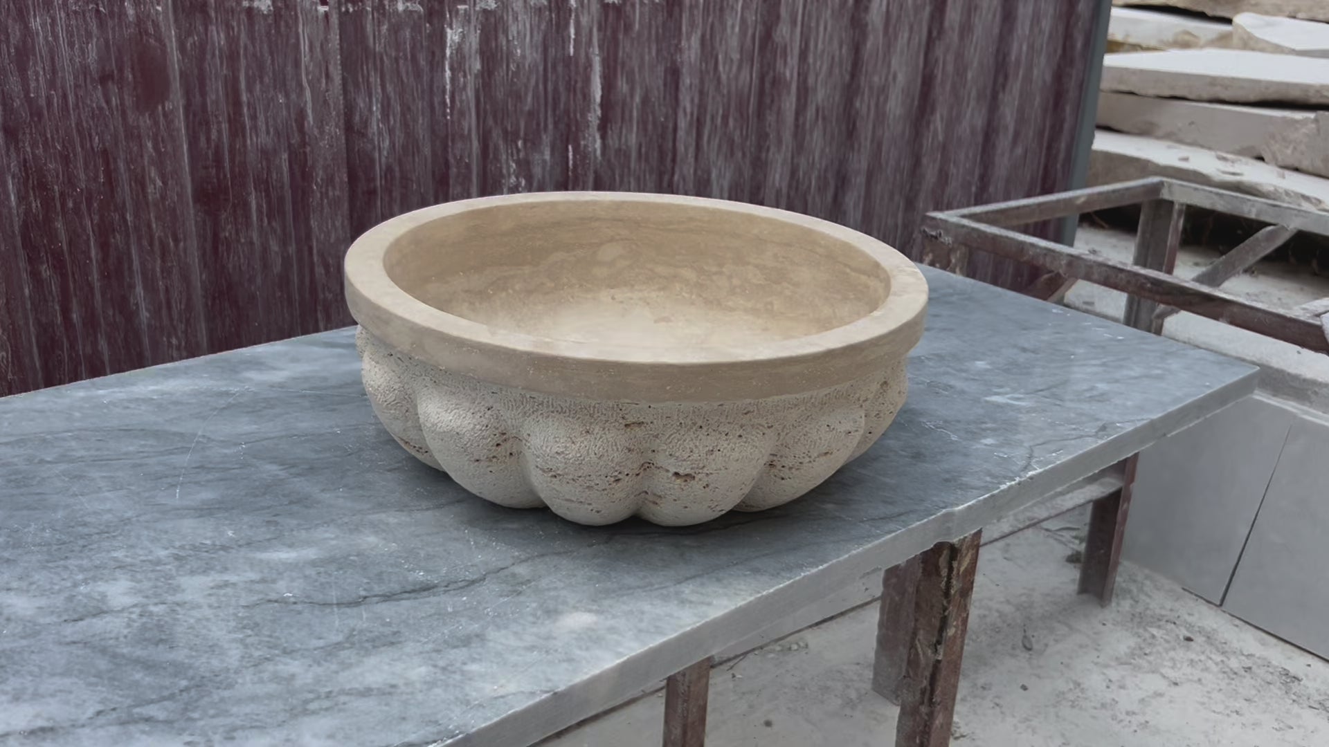 Introducing the Sandblasted Travertine Vessel Sink, a beautiful hand carved masterpiece to any bathroom. This pumpkin shaped washbasin adds a touch of elegance to your bathroom and is perfect for any bathroom vanity top.